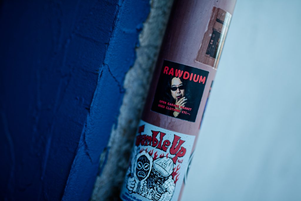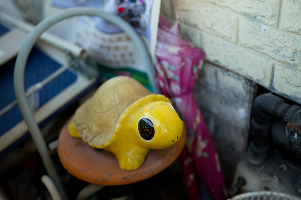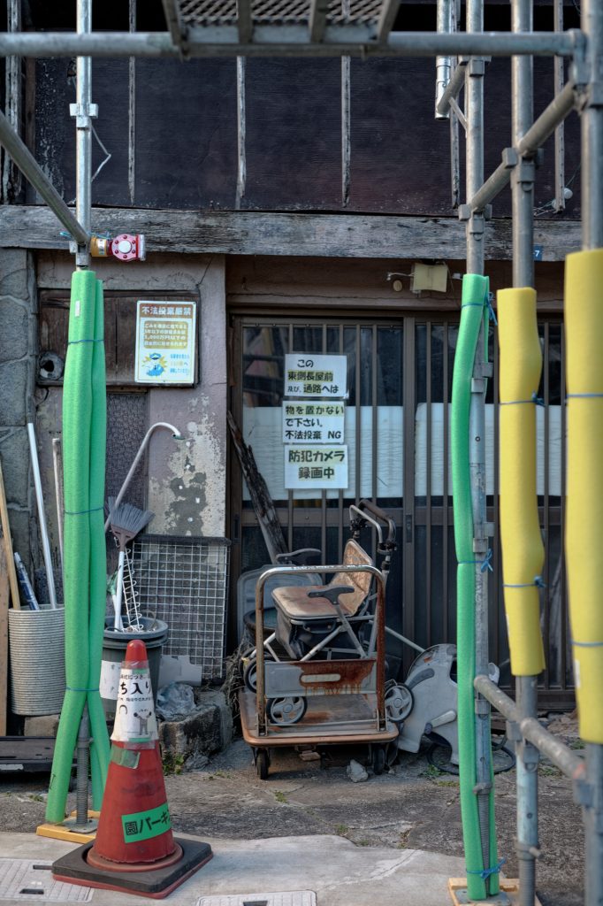 閉店した店舗前に置かれた手押し車すらも古く錆びているよう
