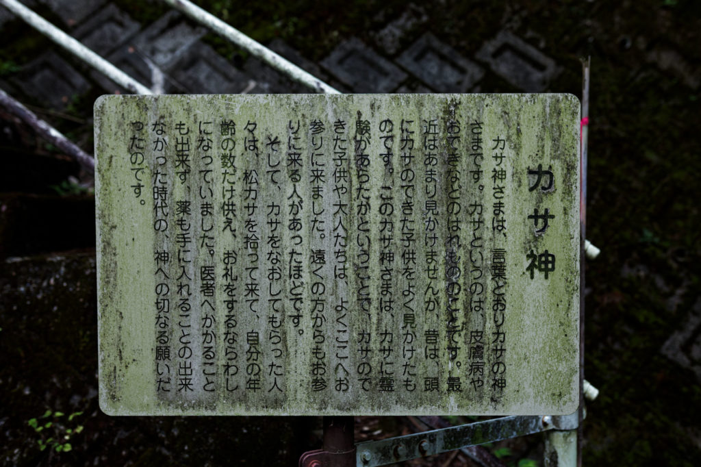 カサ神さまは、言葉どおりカサの神さまです。カサというのは、皮膚病やおできなどのはれもののことです。昔はあまり見かけませんが、頭にカサのできた子供をよく見かけたものです。このカサ神さまは、カサができてしまった子供や大人たちは、よくここにお参りに来る人があったとです。遠くの方からもお参りに来る人があったほどです。そして、カサをなおしてもらった人々は、松カサを拾って来て、自分の年齢の数だけ供え、お礼をするならわしになっていました。医者へかかることも出来ず、薬も手に入れることの出来なかった時代の神への切なる願いだったのです。